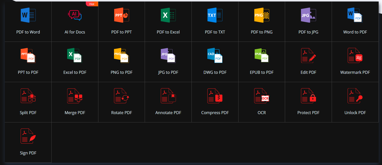 Cet outil propose une palette énorme de 25 outils qui incluent des convertisseurs, une IA conversationnelle, un éditeur PDF performant... Vous l'avez compris tout ce dont vous avez besoin.